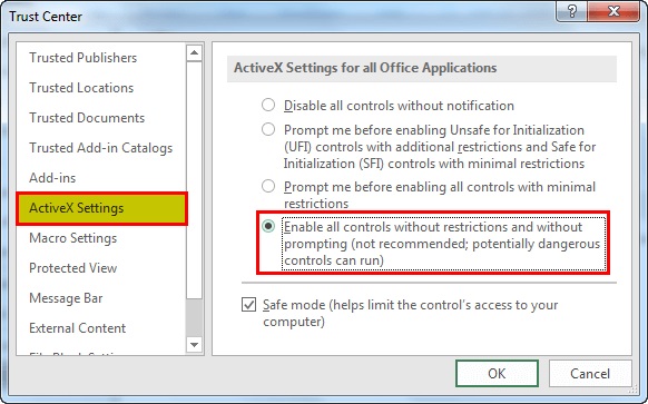 - Click OK to apply the settings and close the Trust Center dialog box.
